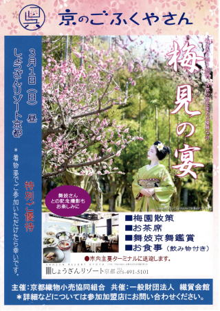本年の着物でお出かけ企画は3月9日(土)にホテルグランヴィア京都にて、ディナーショーを開催いたします。 通常1万円のグランヴィア京都のフルコースとオールデイズ音楽のライブショーが、6千円で楽しんでいただけるお得なご優待なっております。 参加ご希望の方は2月22日(木)までに当店にご連絡ください。 今年もお着物で楽しくおでかけしませんか? 詳細につきましては、当店にお問い合わせください。