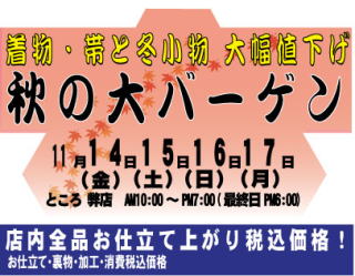 この度、日頃のご愛顧に感謝を込めまして、おしゃれ着物・帯・和装小物・あったかグッズ・プレゼント小物などを多数取り揃えたバーゲンセールを開催いたします。