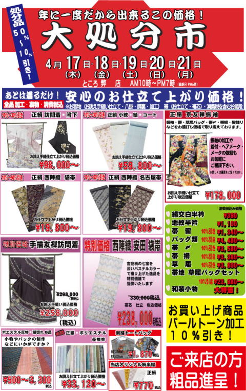 衣替えでしばらく着られないお着物や、 撥水加工したい着物・帯などございましたらこのお得な期間にぜひお持ちください。
